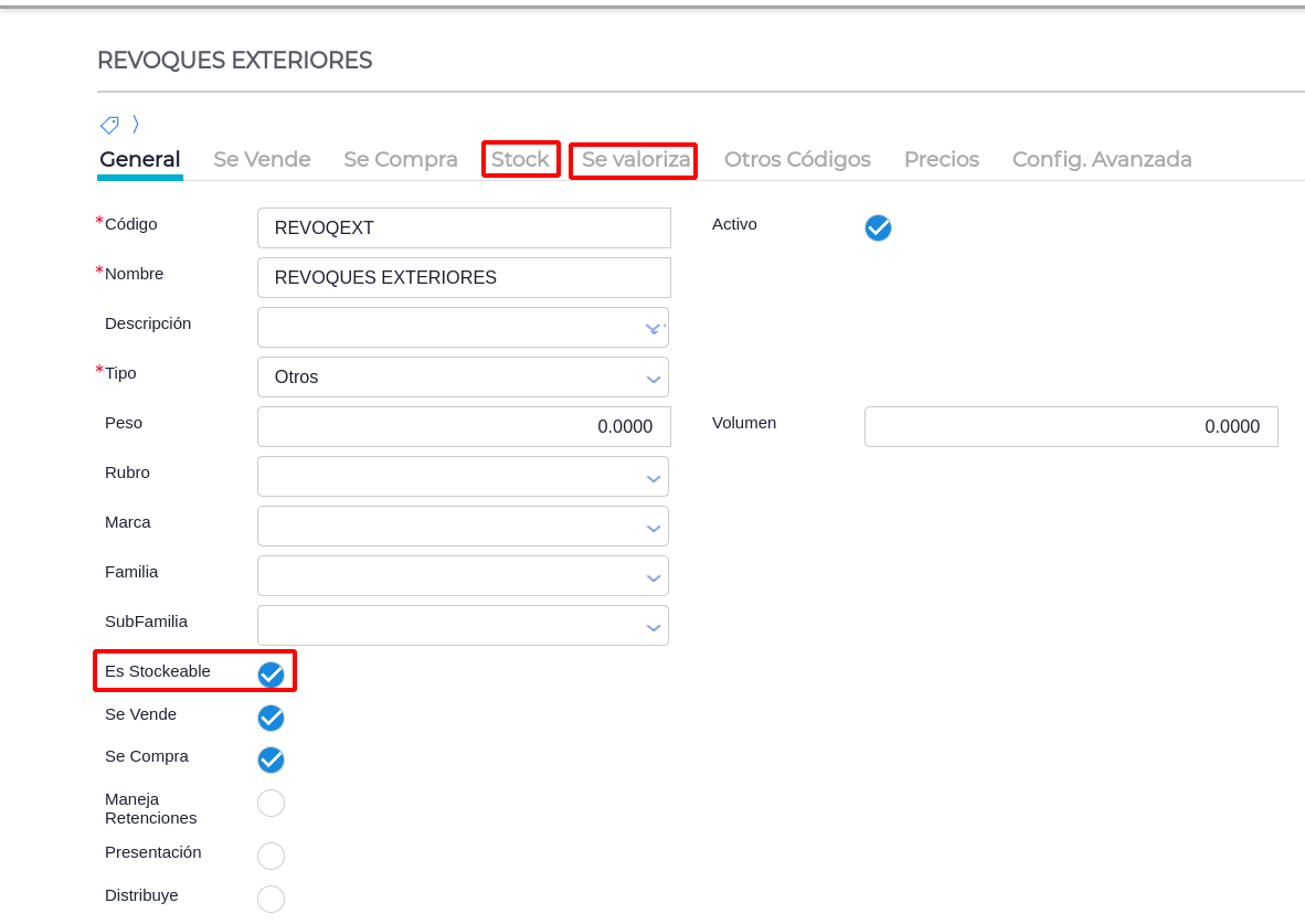 2- Buscar el insumo que se debe modificar, seleccionar el check de Es stockeable y completar los campos necesarios de las solapas que se habilitan