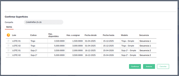 Al presionar en el botón “Siguiente”, el asistente le permitirá confirmar la superficie a asignar a cada cultivo en cada lote: