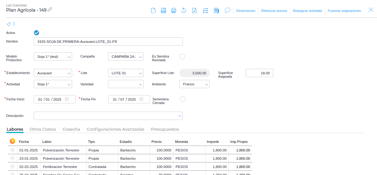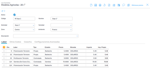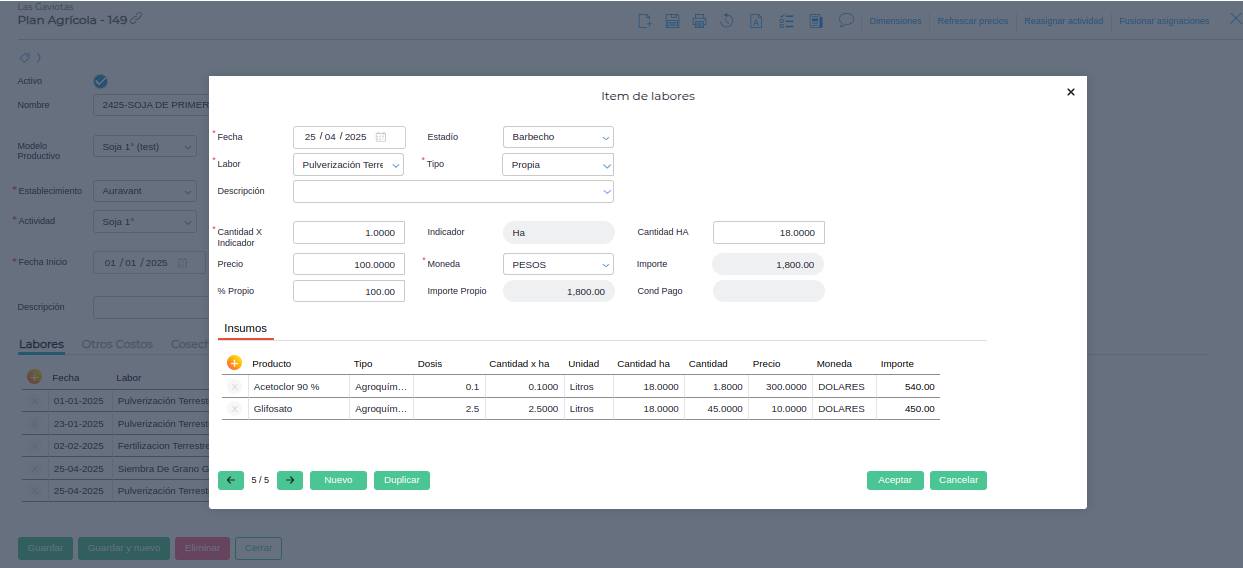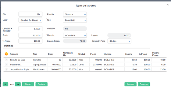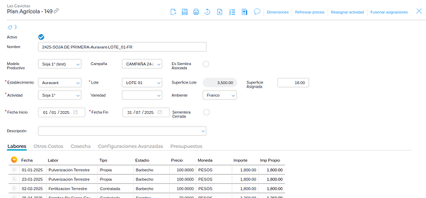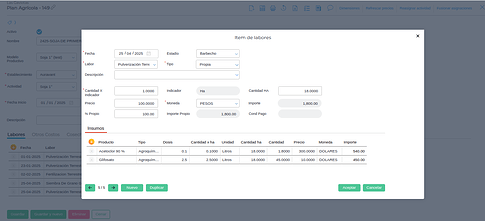 En esta solapa se puede especificar diferentes labores con los respectivos insumos que serán utilizados.
