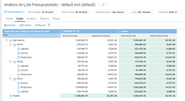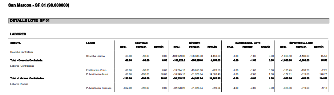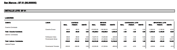 El módulo posee este informe que permite de contrastar la información presupuestada con la real. Dicho informe muestra toda la información de que se genera en los planes agrícolas y la compara con los resultados de los laboreos, cosechas y otros gastos relacionados a la producción con su correspondiente desvío.