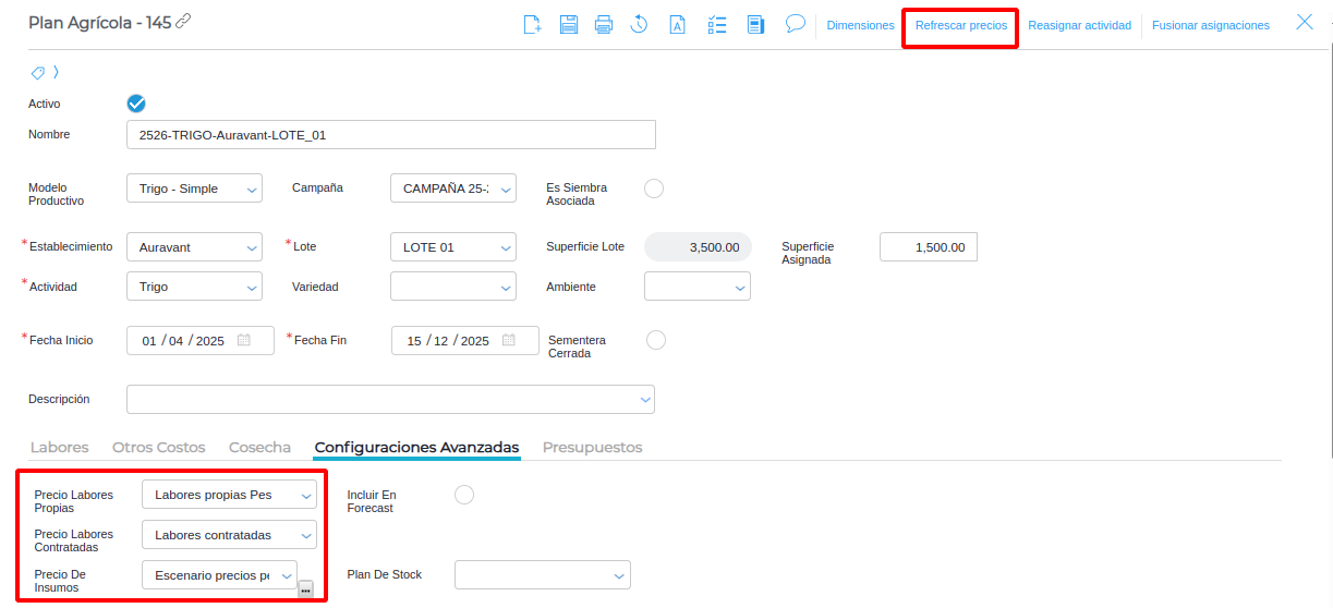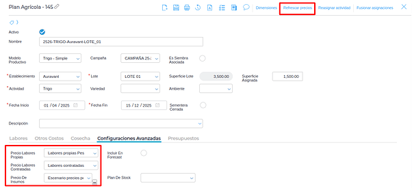 Dentro de cada planificación tienes disponible la opción de “Refrescar precios” el cual actualizará los precios definidos en los “tarifarios de labores” y “Precio de insumos”. Si la planificación NO tiene definidos estas configuraciones NO se actualizarán los precios.