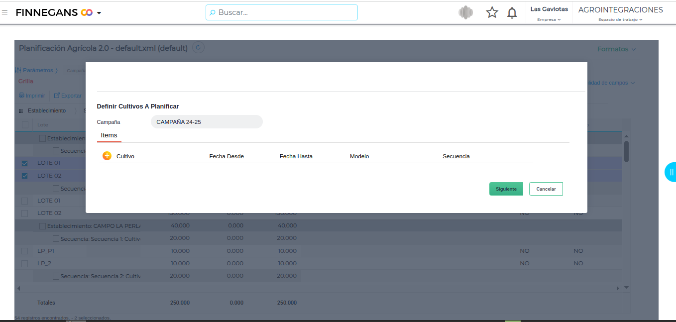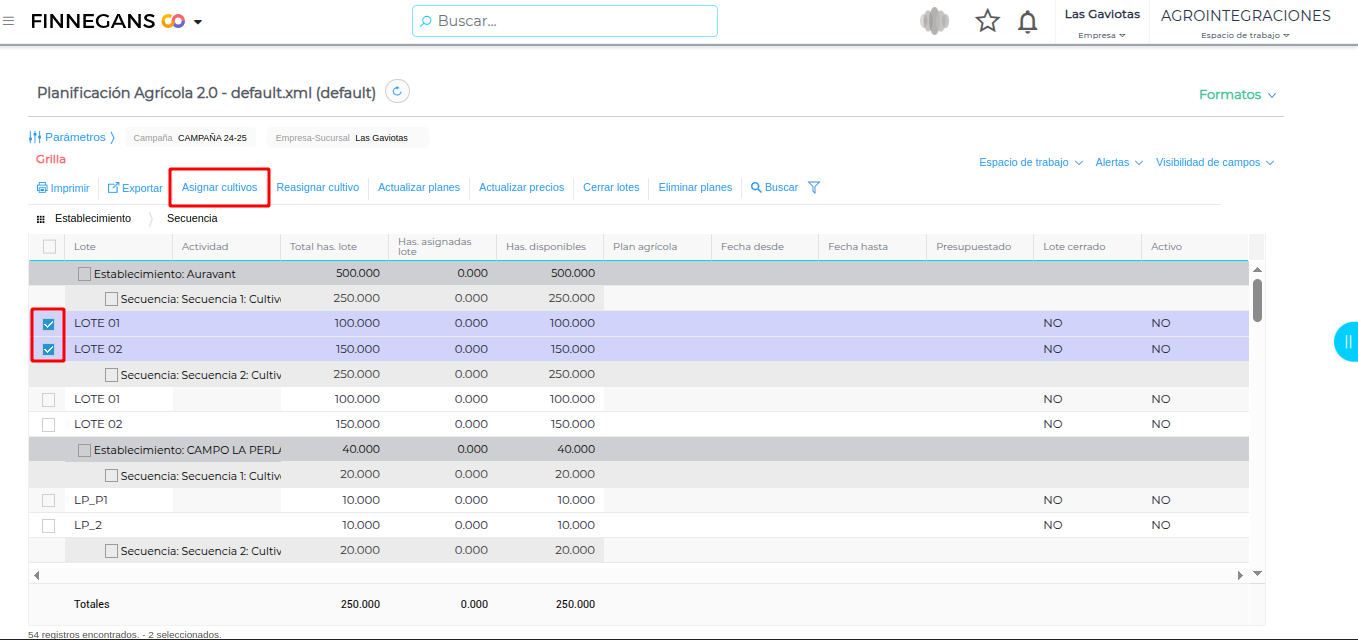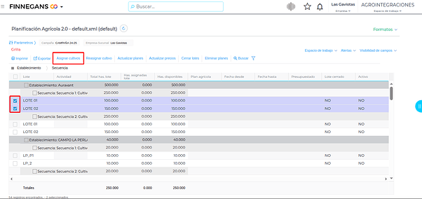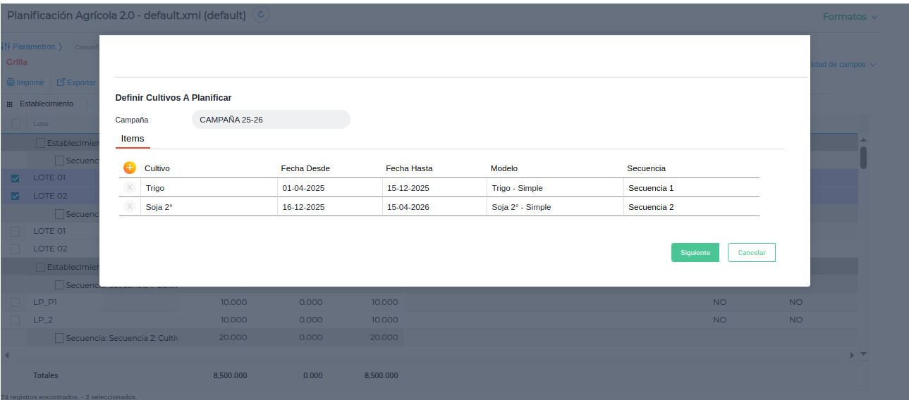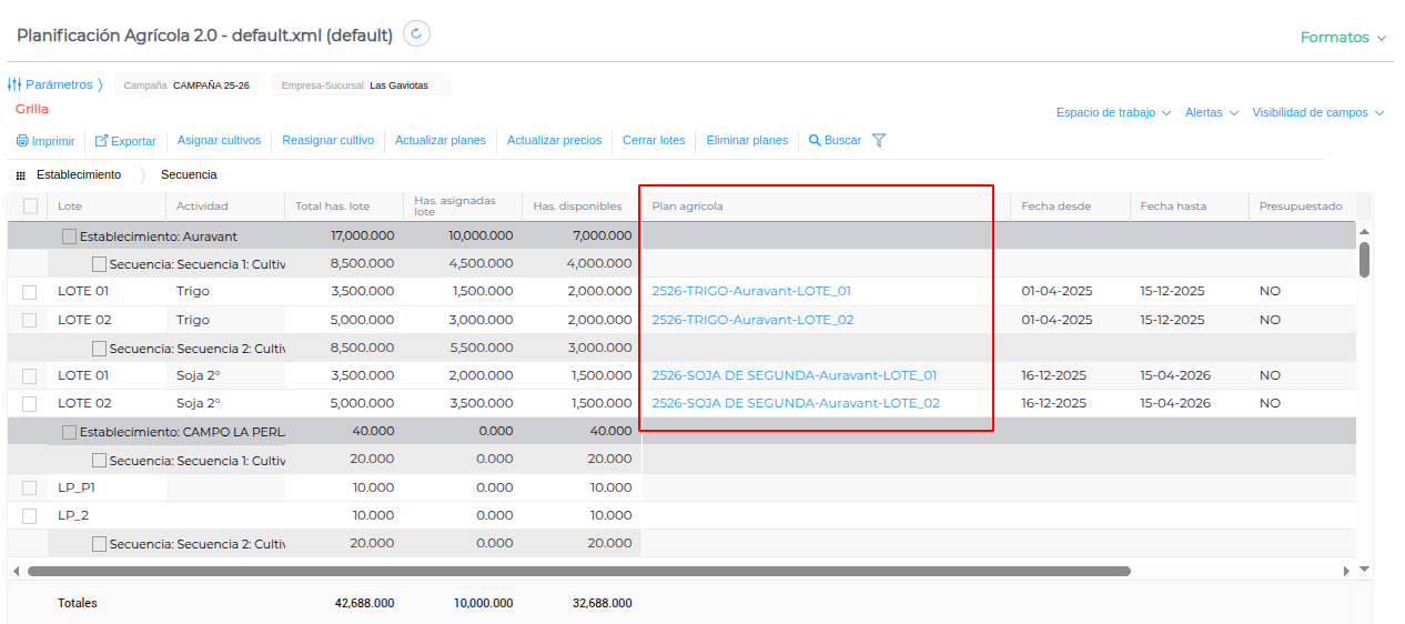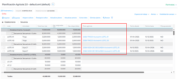 El resultado obtenido de la planificación se verá en la grilla. Se generarán los planes agrícolas para los lotes seleccionados y en la secuencia correspondiente: