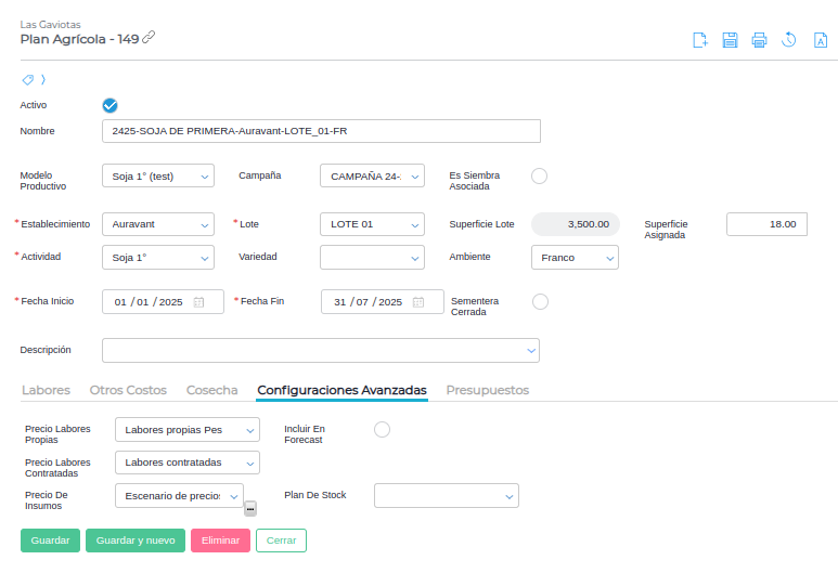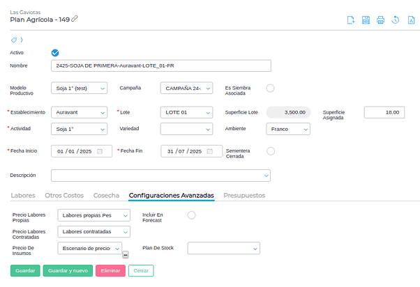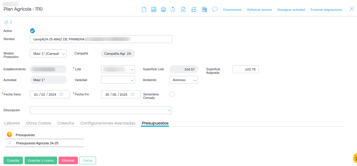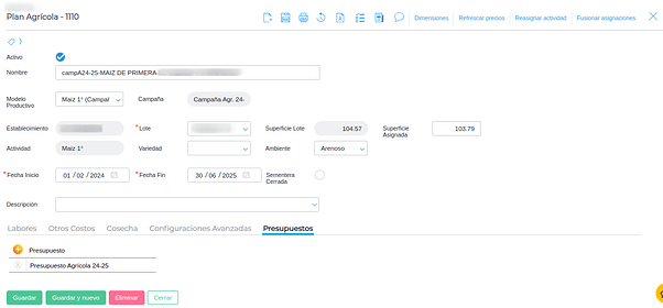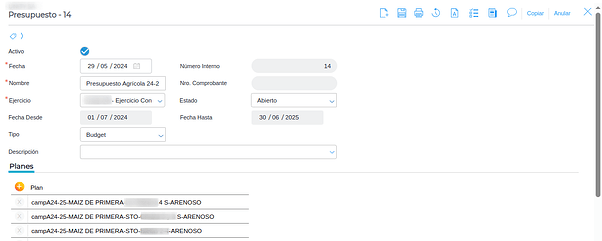 La asignación de un presupuesto a planes agrícolas se hace automáticamente al guardar las planificaciones. Esto siempre y cuando exista un presupuesto activo según las fechas de vigencia, empresa y que el presupuesto sea de tipo FORECAST.