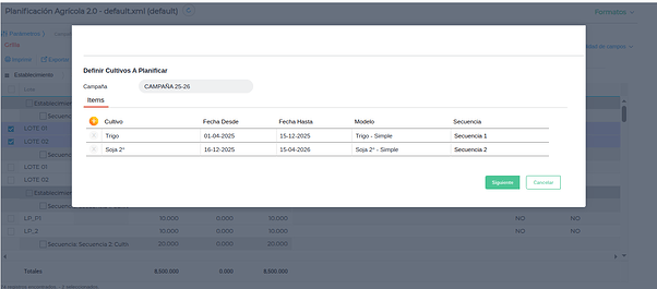 *Secuencia: Es una subdivisión de una campaña que permite diferenciar dos cultivos que forman parte de la misma campaña. Por ejemplo, si en una campaña determinada vamos a planificar sembrar trigo-soja, el trigo sería el cultivo de Secuencia 1; y la soja sería el cultivo de Secuencia 2.