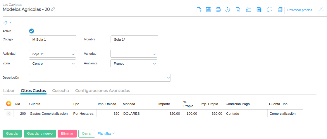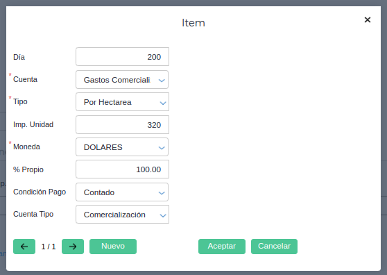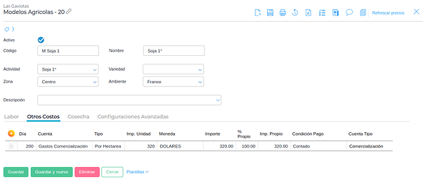Para este ejemplo se genera un gasto de comercialización que está aplicado a la cuenta homónima. Tiene un precio de 320 dólares por hectárea y será efectivo a partir del día 200.