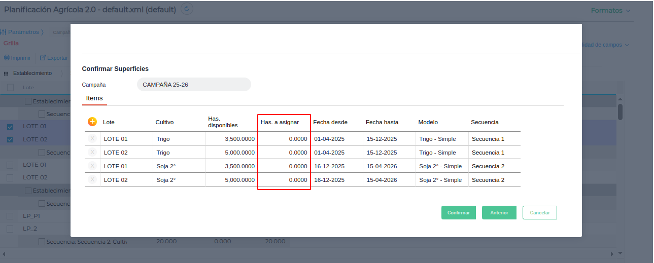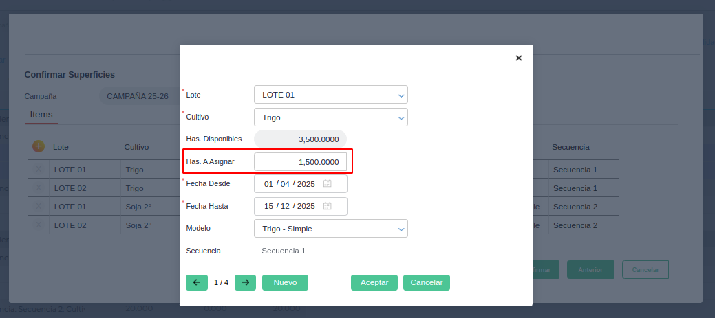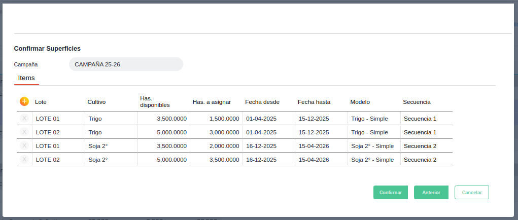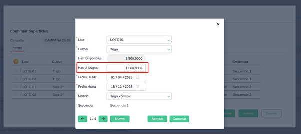 Al presionar sobre cada fila en Has. a asignar se exhibe un nuevo pop up que además de permitir indicar la cantidad de hectáreas para el cultivo en el lote, permite confirmar los datos de lotes, cultivos, fechas y modelos.