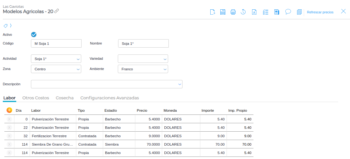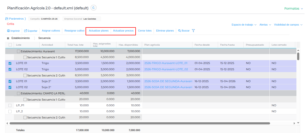 Dentro de la grilla de planificación cuentas con la posibilidad de actualizar precios de labores e insumos de forma masiva: