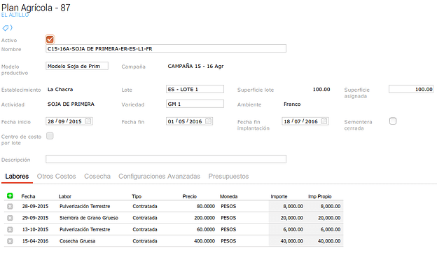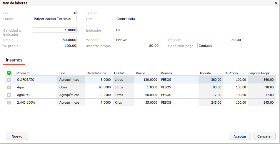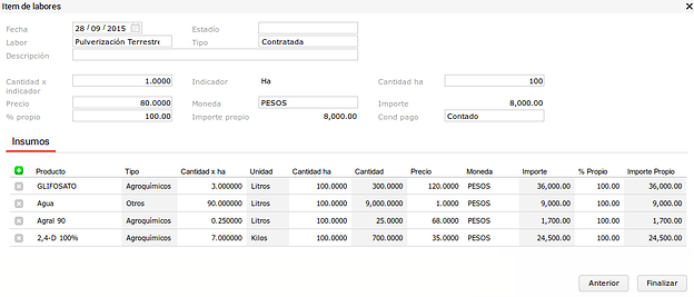 Acá se podrá ver un laboreo con sus respectivos insumos.