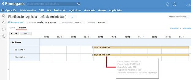 Se contará además con la posibilidad de visualizar lo planificado en el Timeline, el cual también podrá ser usado para planificar. En la siguiente imágen se detalla la información pertinente al plan en cuestión.