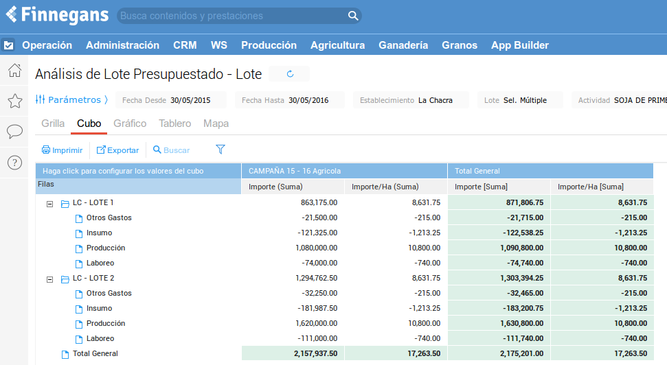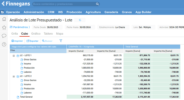 En cuanto a los reportes de gestión se cuenta con un margen bruto presupuestado y comparativo, análisis de lotes, labores e insumos. También se tendrá disponible un tablero de programación agrícola donde poder visualizar las tareas a realizar junto con los consumos estimados y la producción resultante.