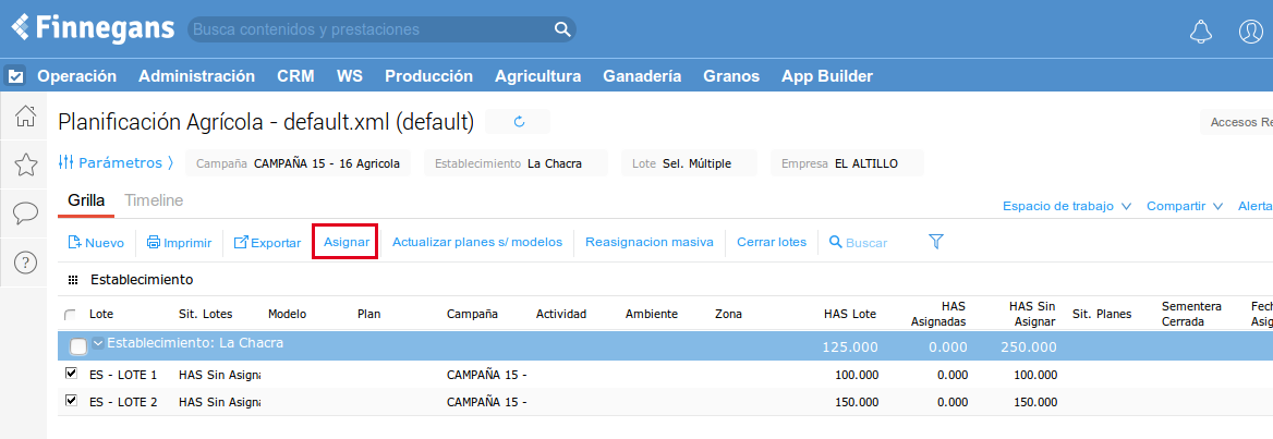 Al seleccionar los lotes a planificar se hace clic “Asignar”. Esto inicializa el asistente.
