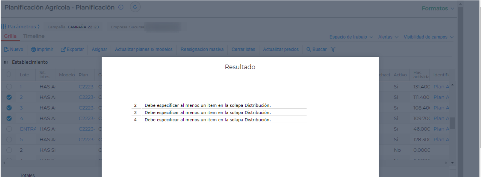 - Ir al plan agrícola y volver a realizar la reasignación de actividades.