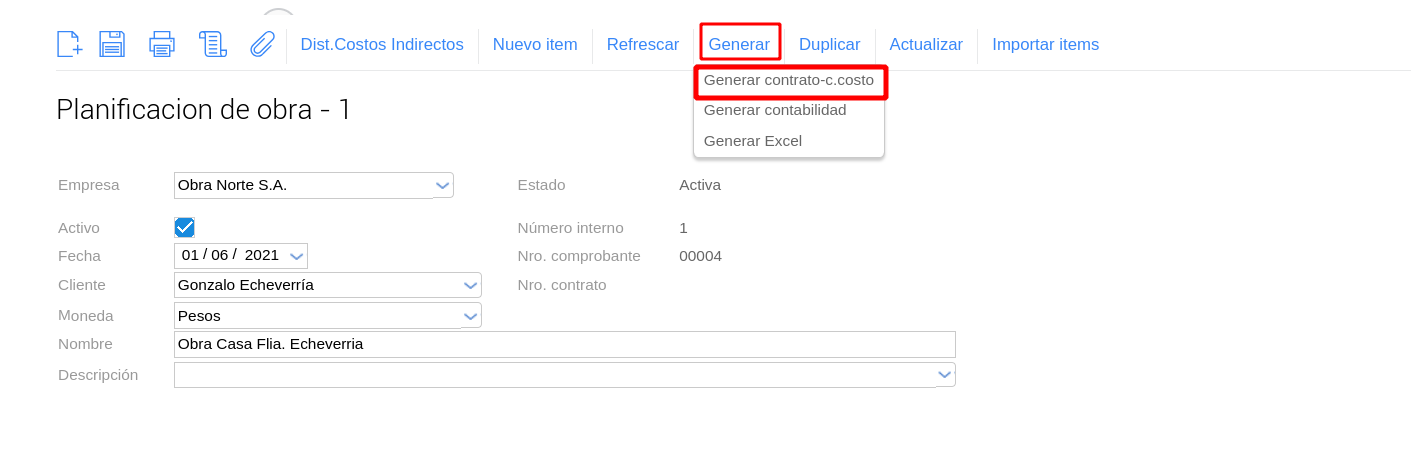 Consulta: El cliente selecciona el botón Generar contrato-c.costo de una planificación de obra
