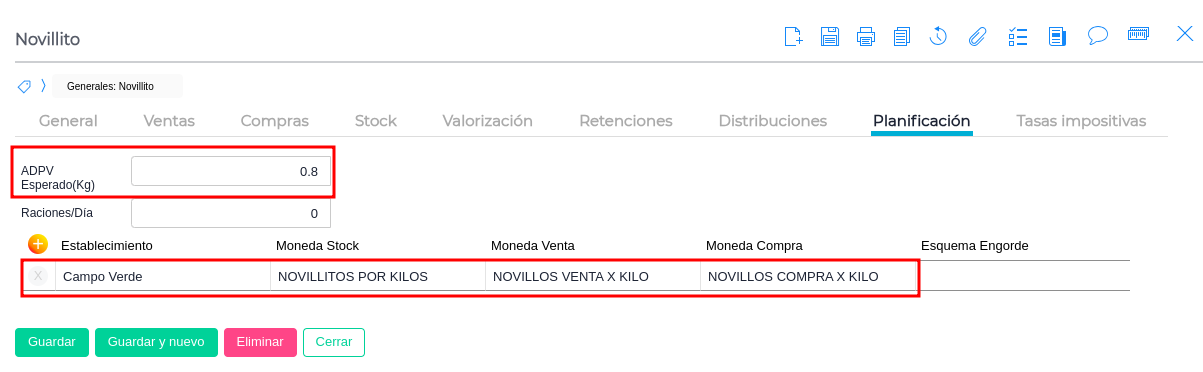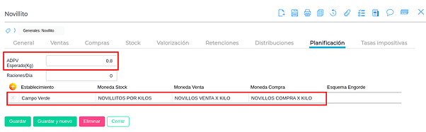 Adpv esperado(kg): Valor que indicará el incremento diario de peso esperado para cada categoría (aumento diario de peso vivo), por lo general se usa para dejar reflejado la producción de kilos de carne en las diferentes actividades ganaderas (invernada, feedlot etc). Estos aumentos se reflejan en los cambios de categoría planificados.