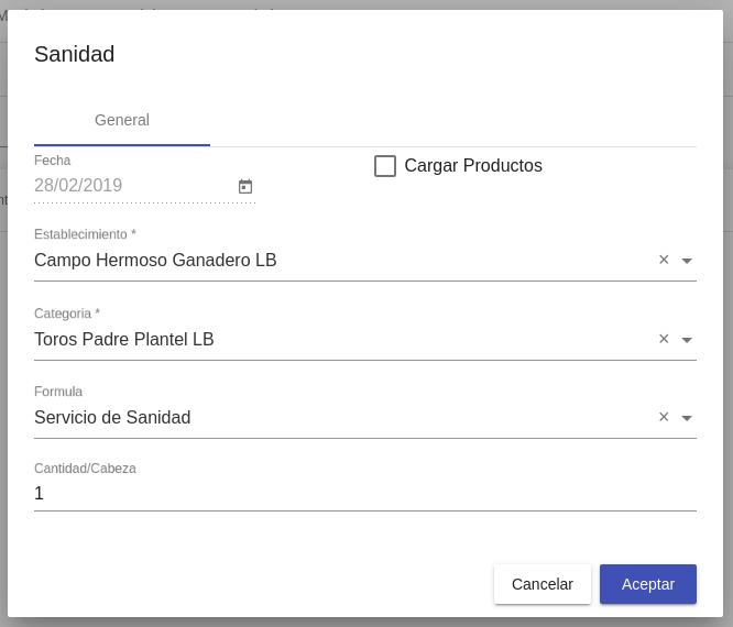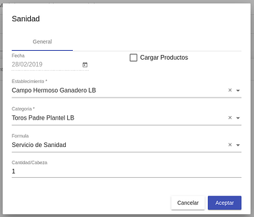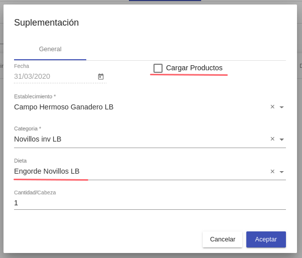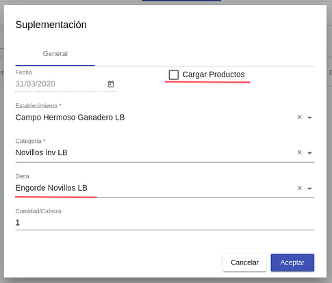 Cargar productos: Seleccionado este check se carga manualmente uno a unos los productos a usar en las suplementaciones
