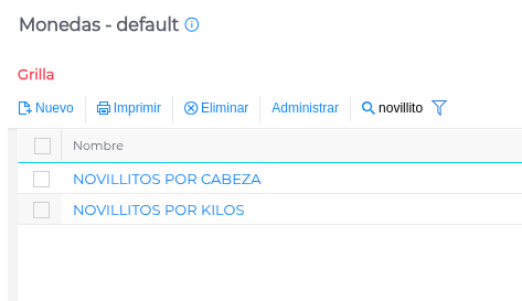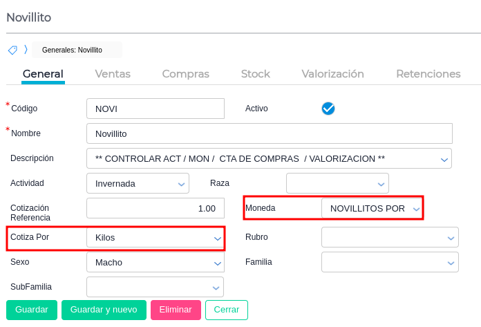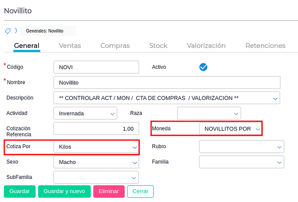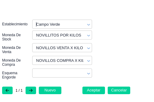 Moneda de stock: Moneda de la cual se definirán los precios de movimientos internos para cada categoría/establecimiento (tener en cuenta que los precios de la cotización de la moneda sean por kg o por cabeza según sea el caso)