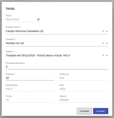 Nota: Respecto a los kilos/cabeza actuales del selector “Ingreso” ; El sistema realiza el cálculo de aumento diario de peso vivo automáticamente según el ADPV indicado en la categoría de hacienda, la fecha de ingreso y la fecha de venta (ver configuraciones más adelante)