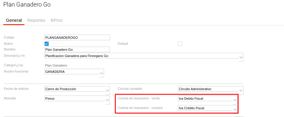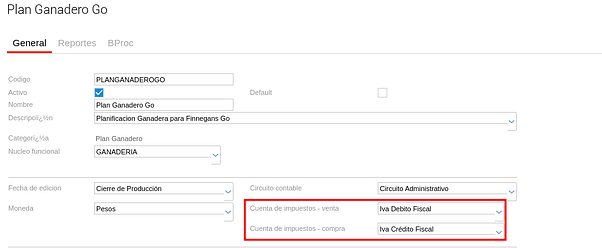 En el tipo de documento para planificación ganadera se indican las cuentas a las que se quiere reflejar el impacto contable de los impuestos de venta y compra de hacienda. Esto con el objetivo de visualizar los importes correspondientes a cada cuenta en los informes presupuestarios.
