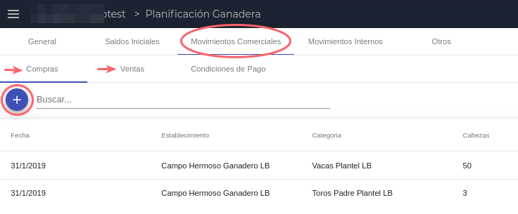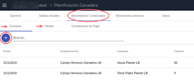 En esta solapa se cargan todos los movimientos comerciales de compra y venta de animales que se prevén para el periodo de la planificación. También hay que definir una condición de pago cada vez que se dan de alta compras y ventas