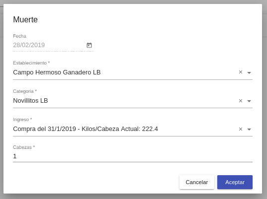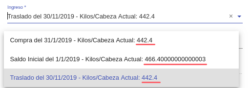 Ingreso*: En este selector se encuentran los movimientos de ingreso para la categoría seleccionada con su correspondiente fecha de ingreso y kg/cab actuales.