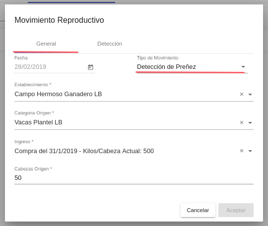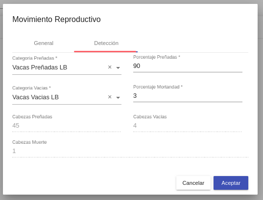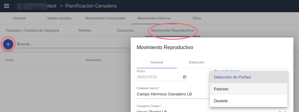 Tipo de movimiento: Selector entre Detección de preñez / parición / destete