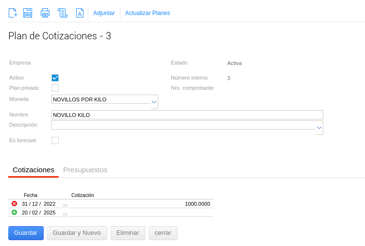 Para cada moneda se requiere dar de alta un plan de cotización en la cual se indican los precios (por kg o por cabeza según la configuración de la categoría de hacienda) y su correspondiente fecha de cotización. De esta forma el sistema toma la cotización de la fecha en la que realizan las operaciones (compra, venta, movimientos internos etc) de la planificación para determinar los resultados a presupuestar.