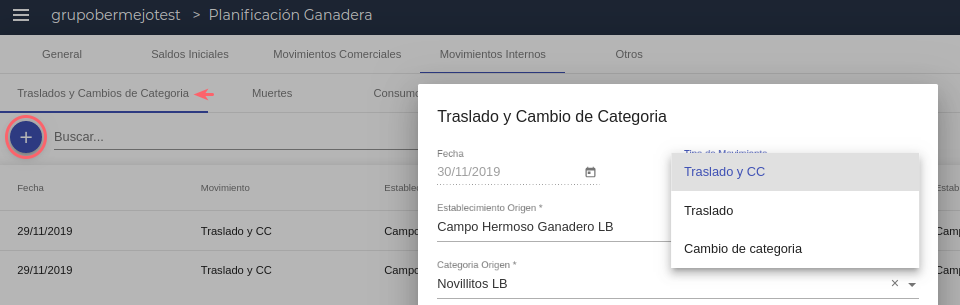 En esta solapa tienes la opción de dar de alta traslados y cambios de categoría según lo previsto en la planificación. En caso de querer reflejar aumento de kilos, se debe configurar el ADPV o esquema de engorde en el maestro de categorías de hacienda, con este dato el sistema realiza el aumento de kilos automáticamente tomando la fecha de ingreso de los animales con su peso original hasta la fecha del cambio de categoría (ver configuraciones más adelante)
