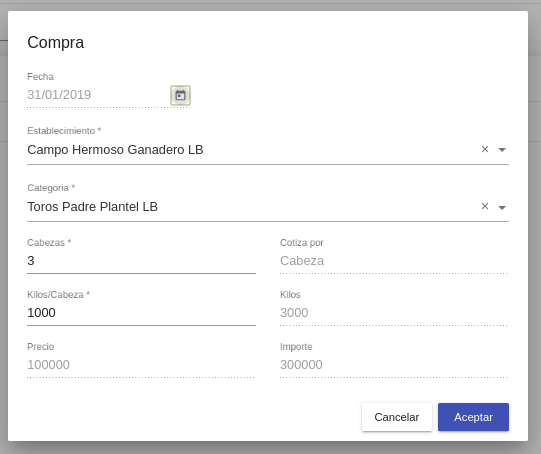 Importe: Importe total (según la cotización de la categoría de hacienda el sistema realiza la multiplicación por cabeza o por kg)