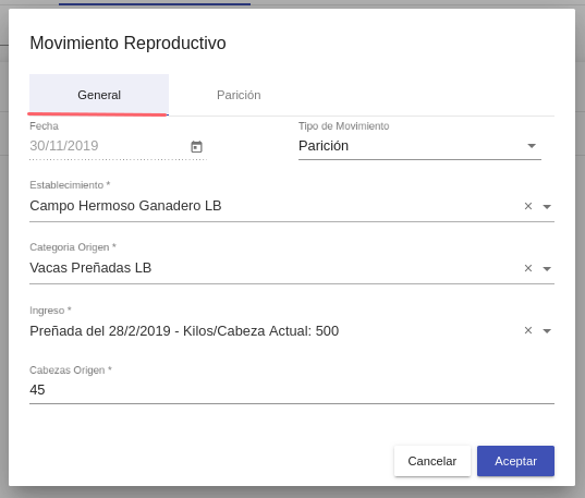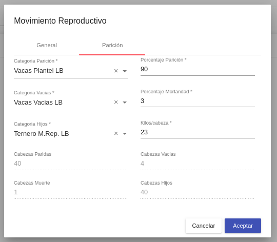Porcentaje parición*: Se define el porcentaje de parición para la cantidad de cabezas seleccionadas en el movimiento de parición(no para la totalidad de animales de la planificación)