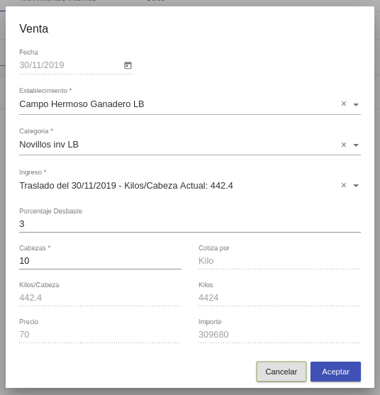 kilos: Total de kilos para la venta (cabezas * kg/cab)