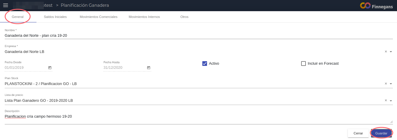 Se completan los siguientes datos de la solapa general y se procede a guardar la planificación: