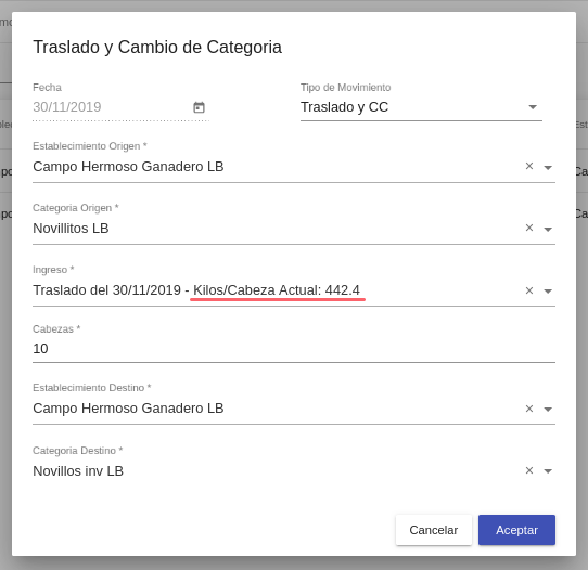 Nota: Respecto a los kilos/cabeza actuales del selector “Ingreso” ; El sistema realiza el cálculo de ADPV (aumento diario de peso vivo) automáticamente según la fecha de ingreso y la fecha seleccionada para el traslado o cambio de categoría (ver configuraciones más adelante)