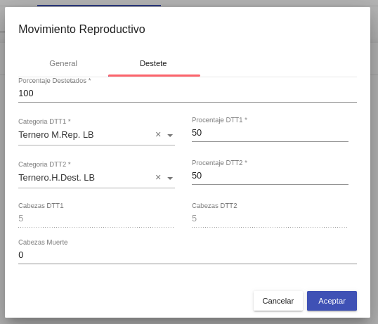 Cabezas DTT 2: (Cabezas origen * % destete) * porcentaje DTT2