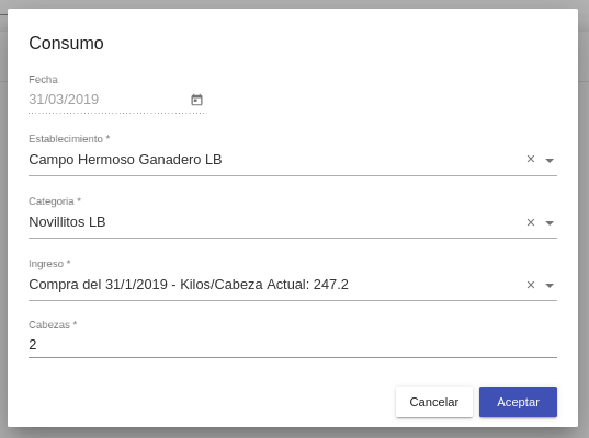 Ingreso*: En este selector se encuentran los movimientos de ingreso para la categoría seleccionada con su correspondiente fecha de ingreso y kg/cab actuales. Si los animales aún no se han dado de alta en el plan este selector no traerá ninguna info.