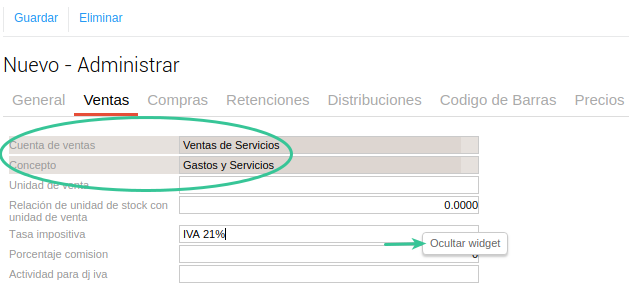 En la solapa ventas podés configurar la cuenta del producto, el concepto, la tasa impositiva y una vez completas podés ocultar los campos. Esto evitará que al momento de crear un producto nuevo de venta de servicios al 21% se cometa el error de indicar, por ejemplo una cuenta equivocada. Además, ayuda a que la persona que vaya a cargar el producto no necesite tener conocimientos contables y se encuentre con un editor simple con pocos campos a completar.
