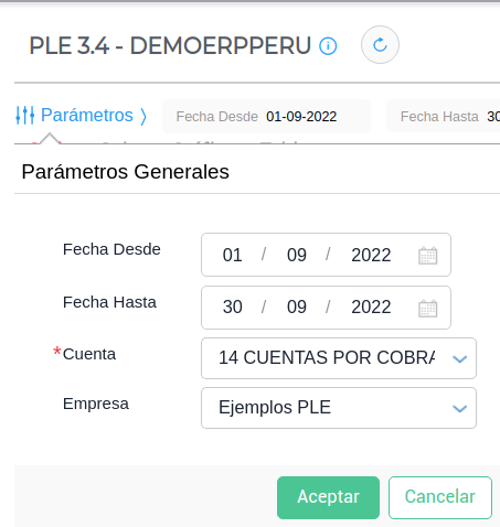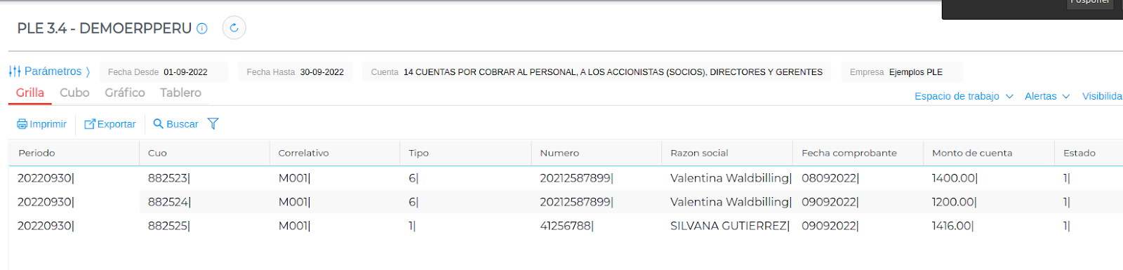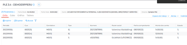 - Cuenta: Deben seleccionarse las cuentas que comienzan con 14 CUENTAS POR COBRAR AL PERSONAL, A LOS ACCIONISTAS (SOCIOS), DIRECTORES Y GERENTES