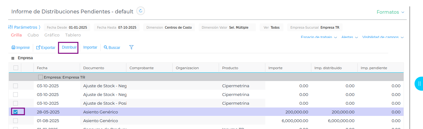 - Esto se puede hacer desde el informe de Distribuciones Pendientes, cambiando la asignación de Centro de Costo en el asiento genérico.