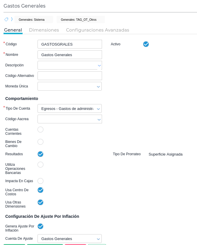 En caso de realizar el ajuste por inflación desde el sistema será necesario tener configurado el check de “Genera Ajuste por Inflación” y tener configurada una Cuenta de Ajuste.