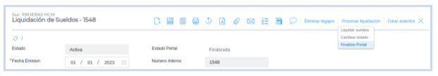 Desde el módulo de Liquidación de sueldos, debe ingresar a la liquidación cuyos recibos se deseen enviar y realizar la acción Finalizar Portal.