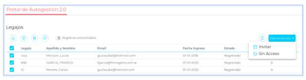 Al seleccionar el / los legajos, ya sea al momento de tener que invitar (pudiendo usar el mismo botón en caso de querer re-invitar) o dejarlo sin acceso al portal, desde Acciones