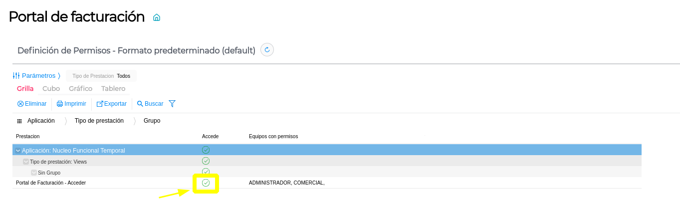 - Al aceptar los parámetros, el informe muestra, en la columna “Equipos con Permisos”, los equipos con acceso a la prestación Portal de Casos.