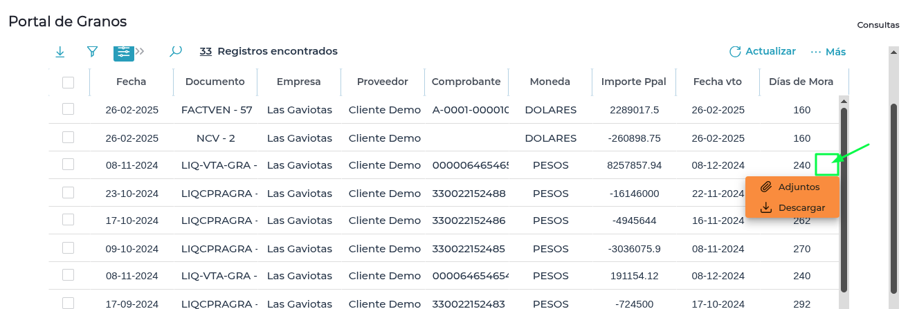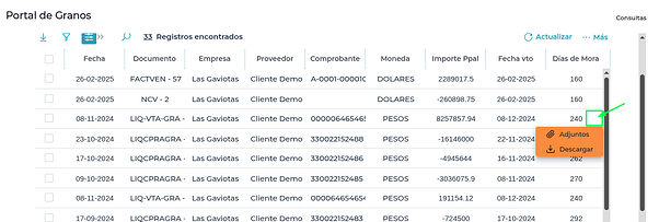 Presionando los 3 puntos que se encuentran al final de la línea, se pueden descargar los archivos asociados a las facturas de venta, compra, notas de crédito, notas de débito, liquidaciones de granos y canje)
