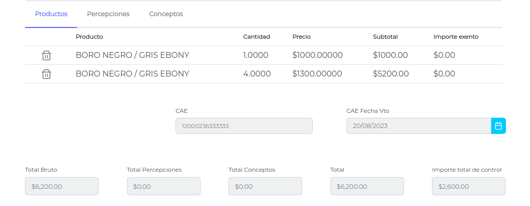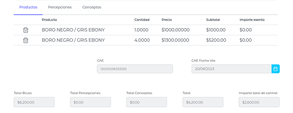 Presionando el botón “Aceptar”, los productos serán cargados en el formulario de la factura.