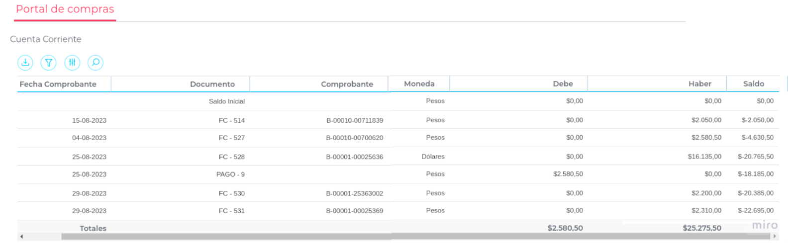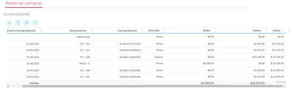 A través del enlace Cuenta Corriente desde el Home el proveedor podrá podrá acceder a información acerca de los movimientos de su cuenta en relación a las Facturas generadas y a los pagos realizados por su cliente.