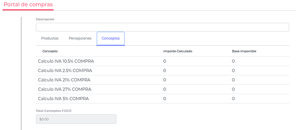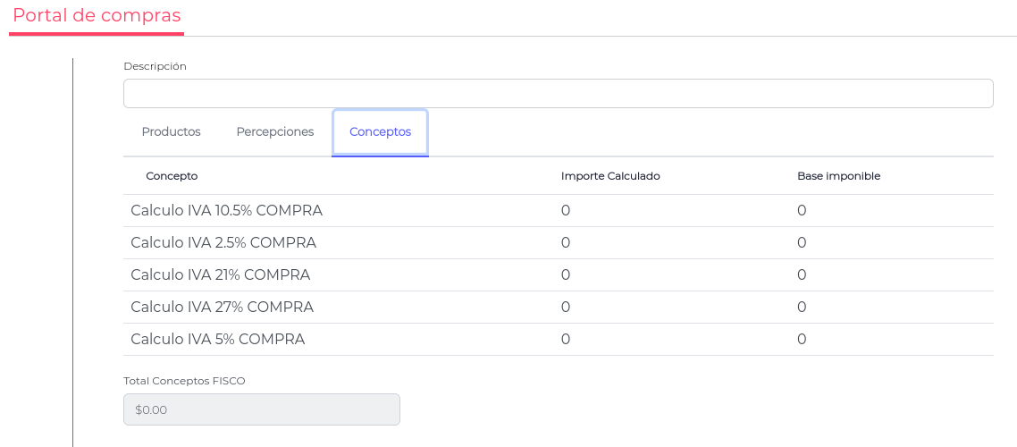 En la solapa con Conceptos, se podrán dar de alta los conceptos seleccionando la tasa correspondiente.