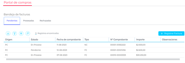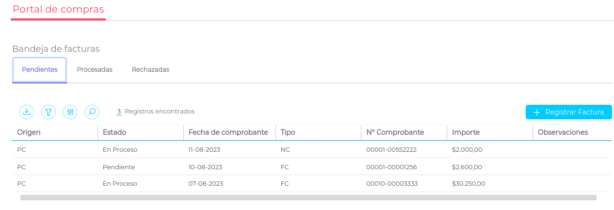 En esta pantalla podrás visualizar la bandeja de facturas dividida en 3 solapas, según el estado en que se encuentren:
