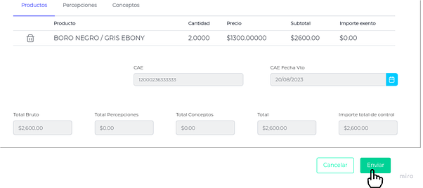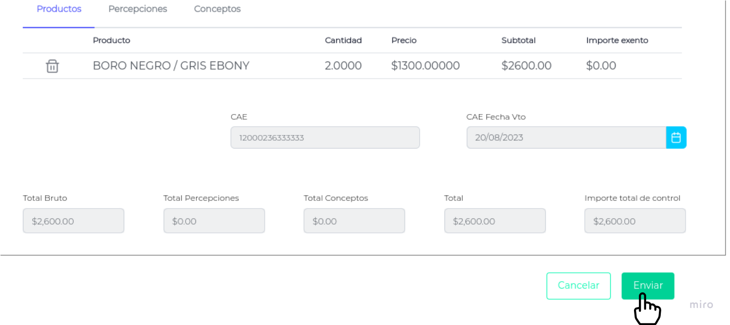 Una vez completada la información relacionada a Productos, Percepciones y Conceptos presionar el botón “Enviar”.