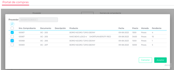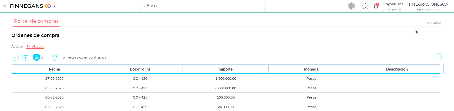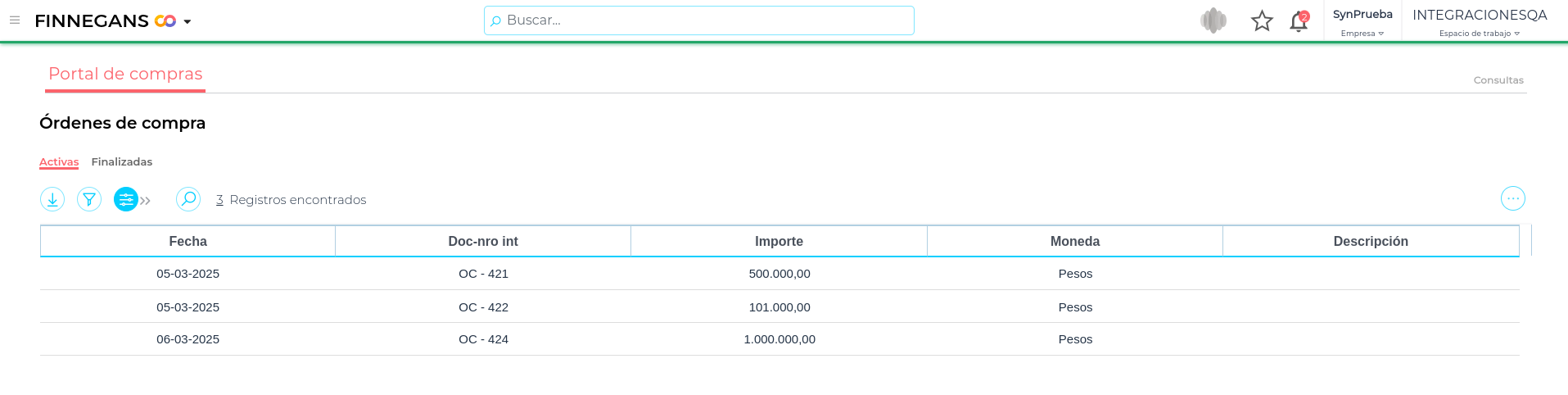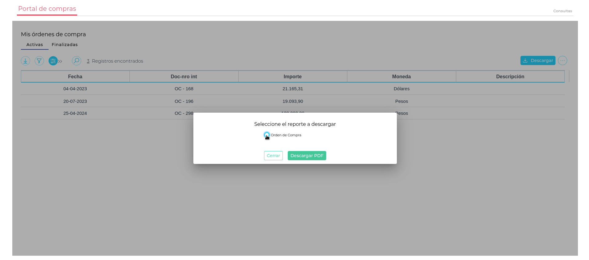 En ambas pantallas podrá ver información relacionada a la órdenes de compra, tal como Fecha, Número de documento interno, Importe, Moneda y Descripción.