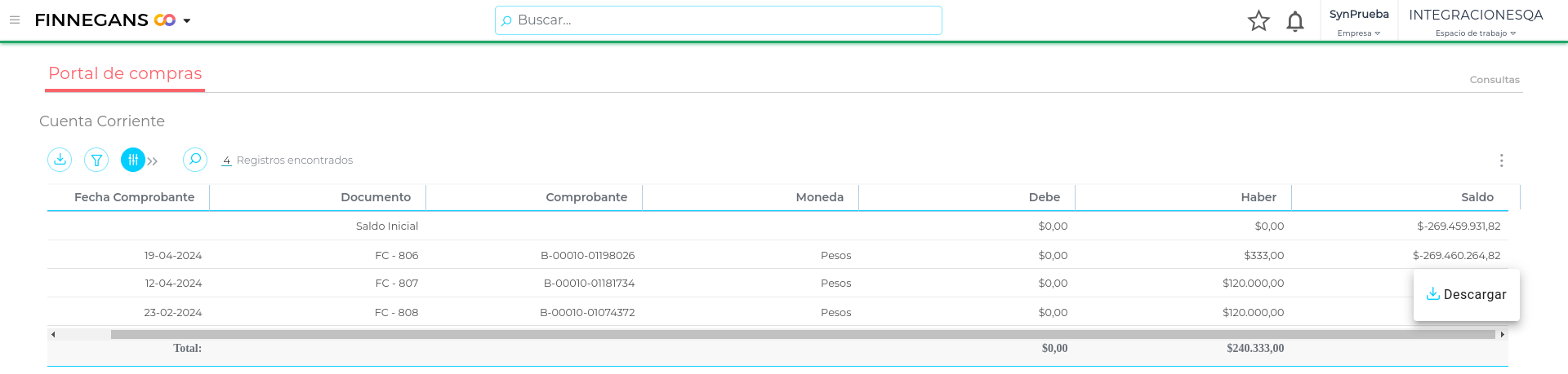 Desde este informe de Cuenta Corriente, el Proveedor al posicionarse sobre un registro de interés, podrá acceder desde la derecha al botón Descargar.