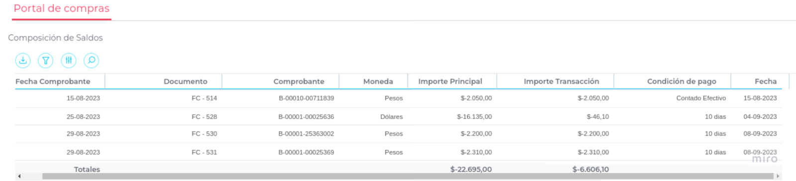 - Visualizar el detalle de las órdenes de compra y los documentos vinculados a las mismas.